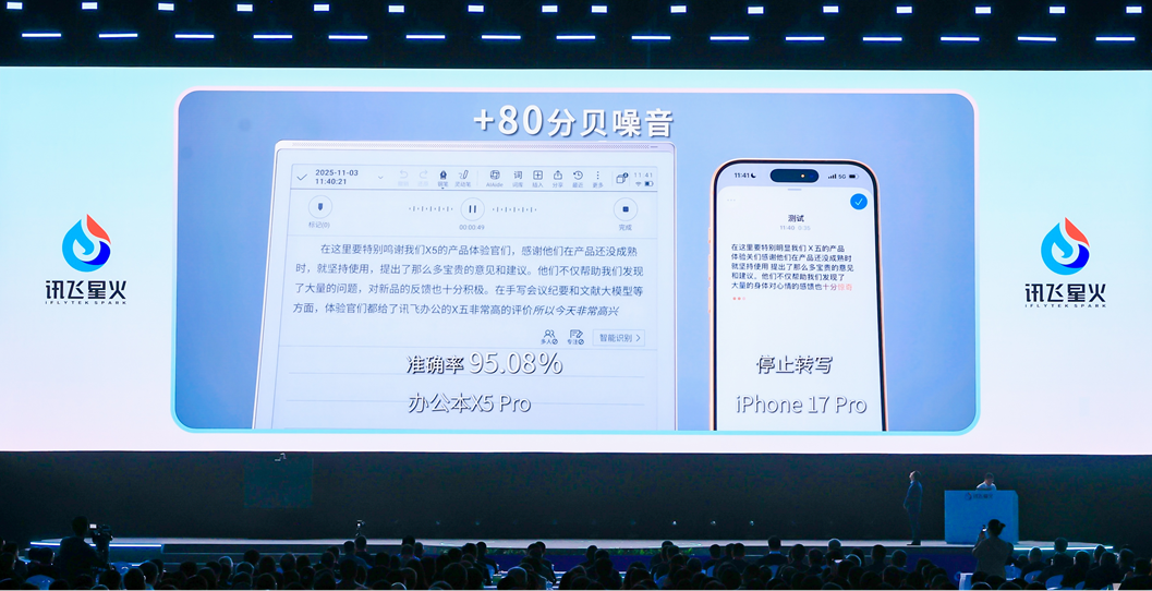 憑借獨家“AI+麥克風陣列技術”,訊飛智能辦公本X5通過首創的上4下4環八麥克風陣列實現超強抗噪,識別效果遠超iPhone 17 Pro,高噪環境下識別準確率達95.08%;訊飛AI翻譯耳機首創單耳三麥多感融合降噪系統,在復雜噪聲下識別準確率高達97.1%;訊飛雙屏翻譯機2.0則獨創強降噪模式,在90dB噪音下識別率達98.69%。此外,業界首個軟硬一體的訊飛同傳麥克風能實現自動翻譯免切換,同傳播報首響延遲低于2s,支持私有化部署。
